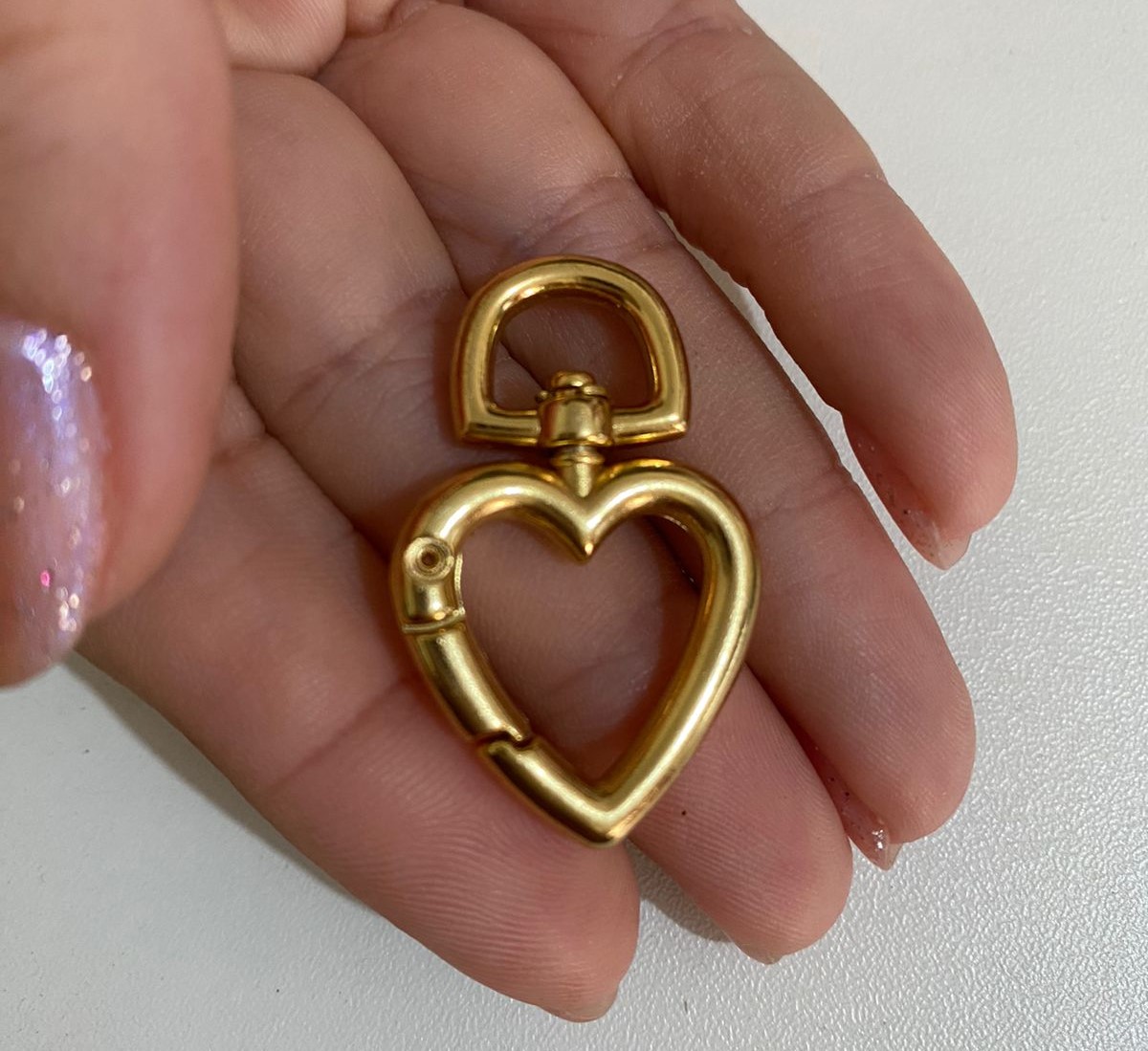 Mosquetão de coração, com 23 MM de largura e 35 MM de altura. Com banho cataforetico. Não descasca!