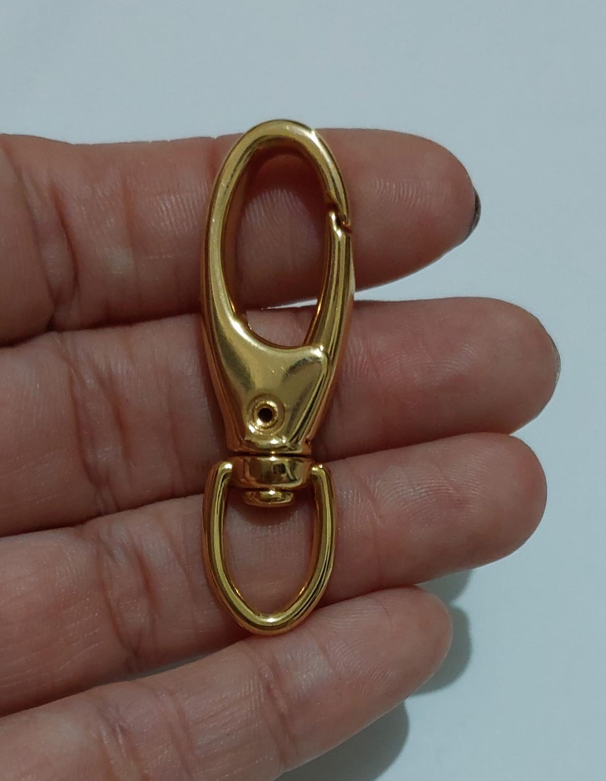 Mosquetão em formato moderno e sofisticado, com 45 mm de comprimento. Banho dourado e verniz cataforético. Alta qualidade e durabilidade.